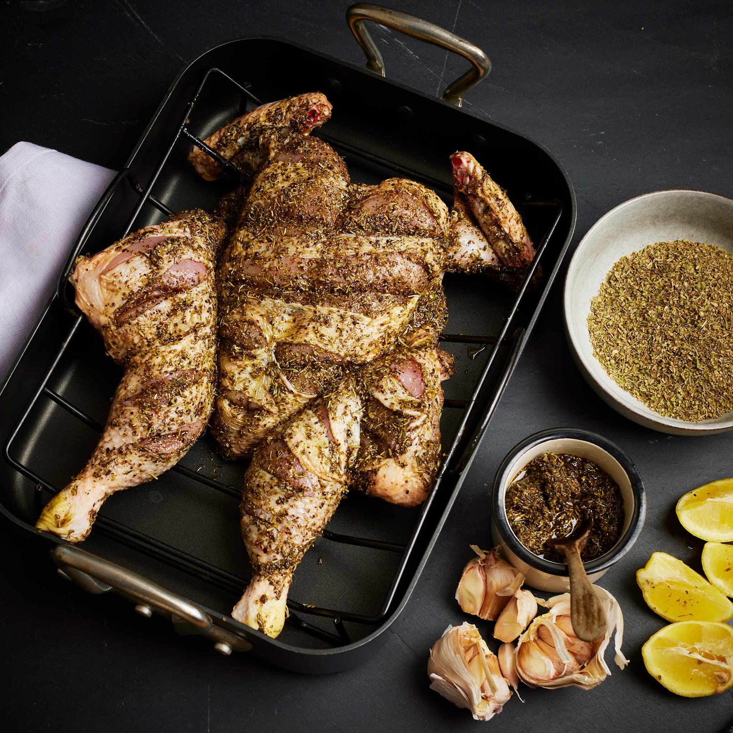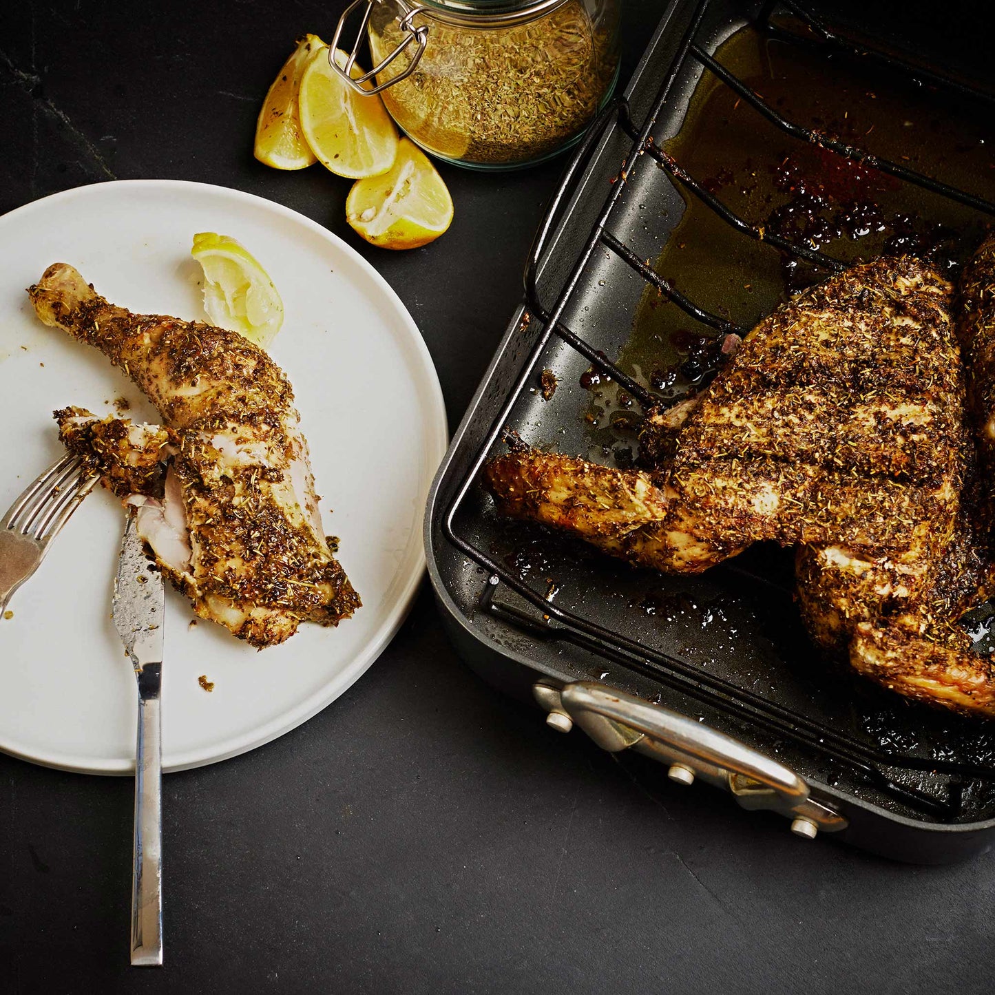 Oven cook our spatchcocked chicken for 45-60 minutes on a medium heat and serve with a squeeze of lemon juice.