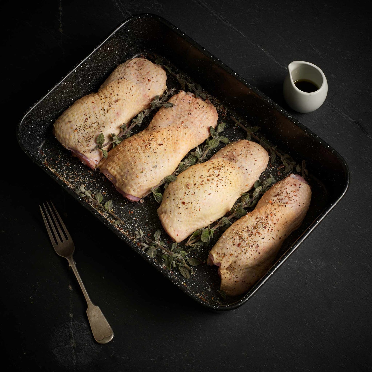 Tried these for the first time and am happy to have discovered a new staple! One boned leg is enough to feed a hungry person (!) and because you can cook them flat (open) you get even more gorgeous crispy skin than with a normal leg, avoiding the pale underside skin!