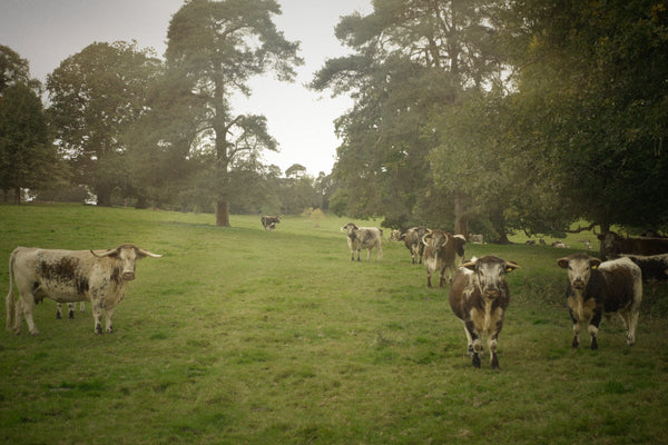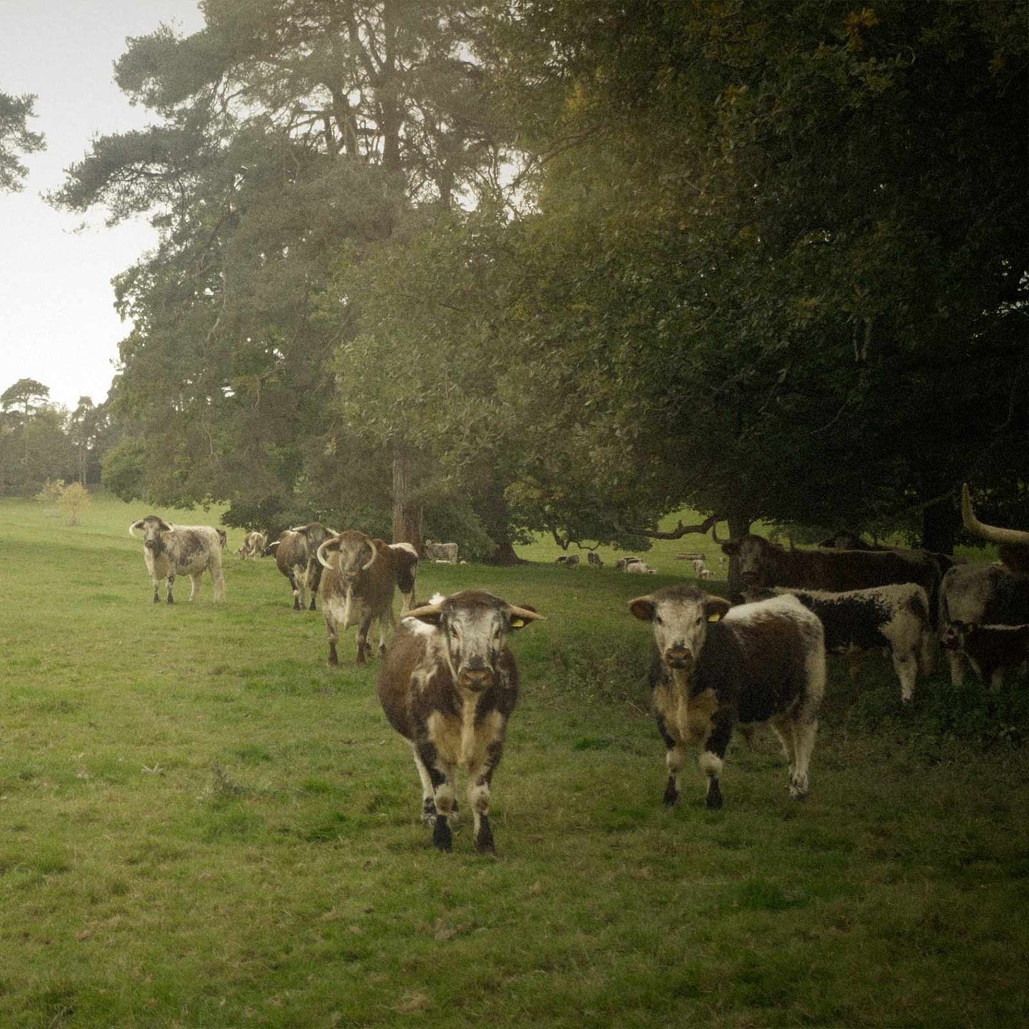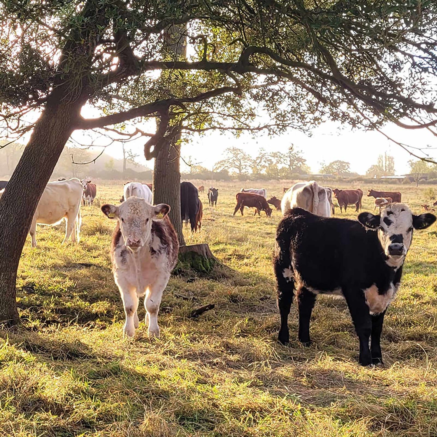 Shorthorn cattle raised in silvopasture and with rotational grazing in East Sussex.