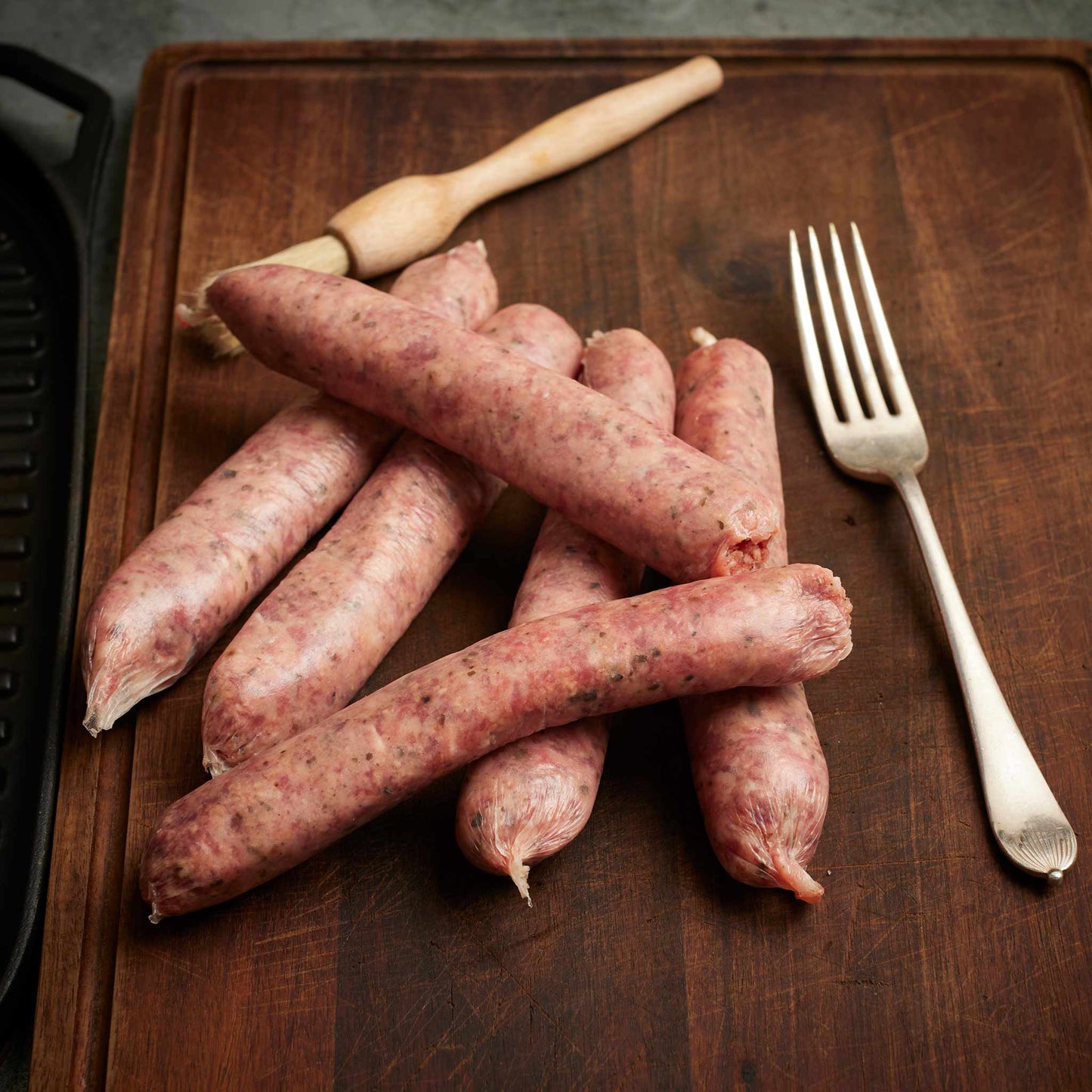 Served in a synthetic skin, for all those who do not or cannot eat pork, this sausage is hand linked, simple and natural but far from basic, and is suitable for all uses, sandwiches, casseroles, fry ups or the BBQ.