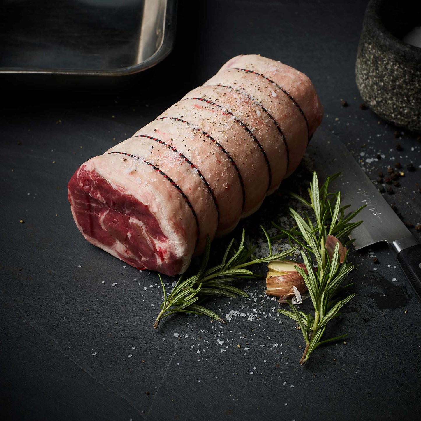 The saddle is from the loin area in the lumbar region and is made up of the loin either side of the animal. Roast in the oven until the internal temperature is 55C to be slightly pink in the middle. It’s a leaner cut than belly with a more delicate flavour and makes a perfect roast for family and friends.
